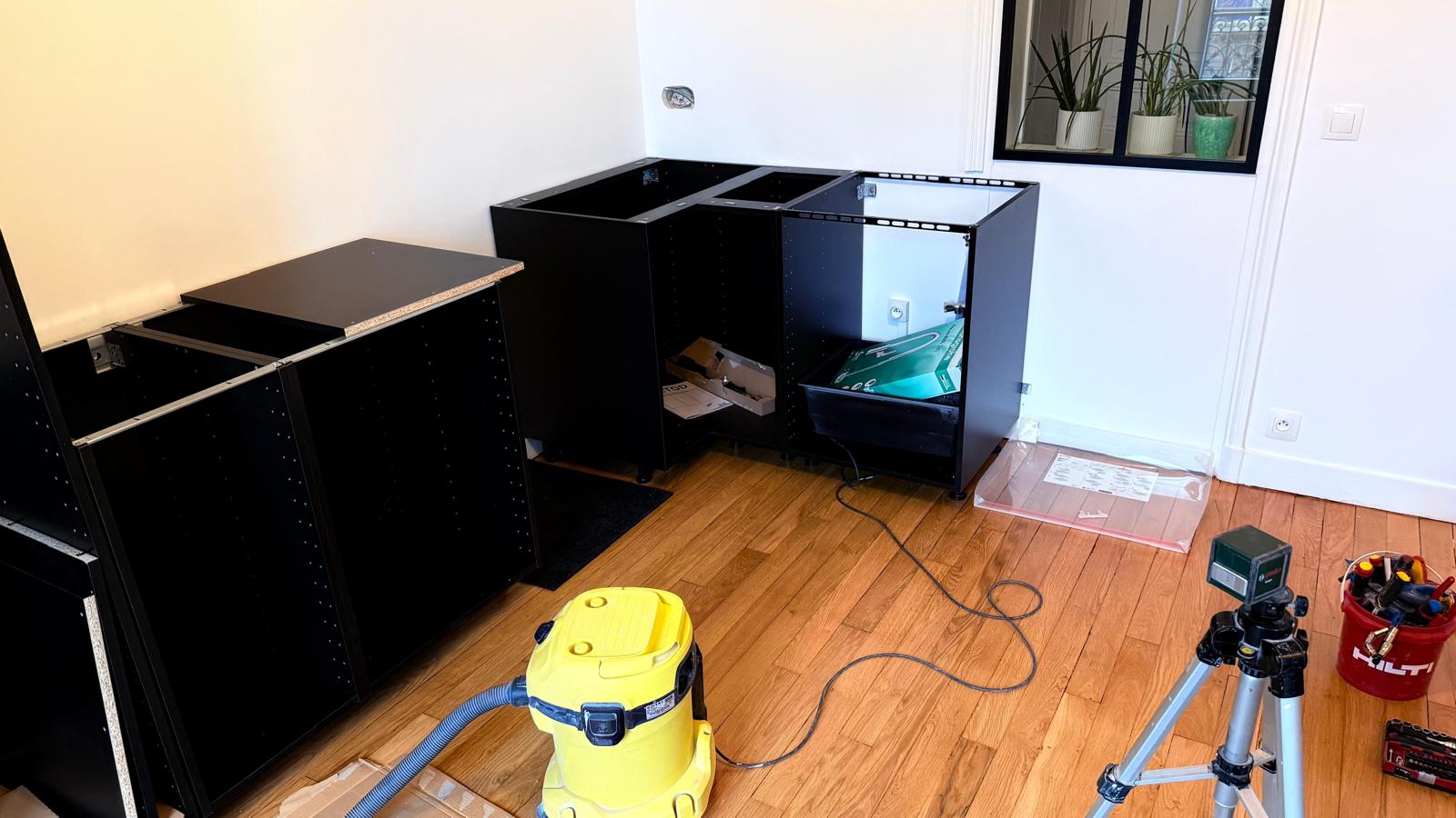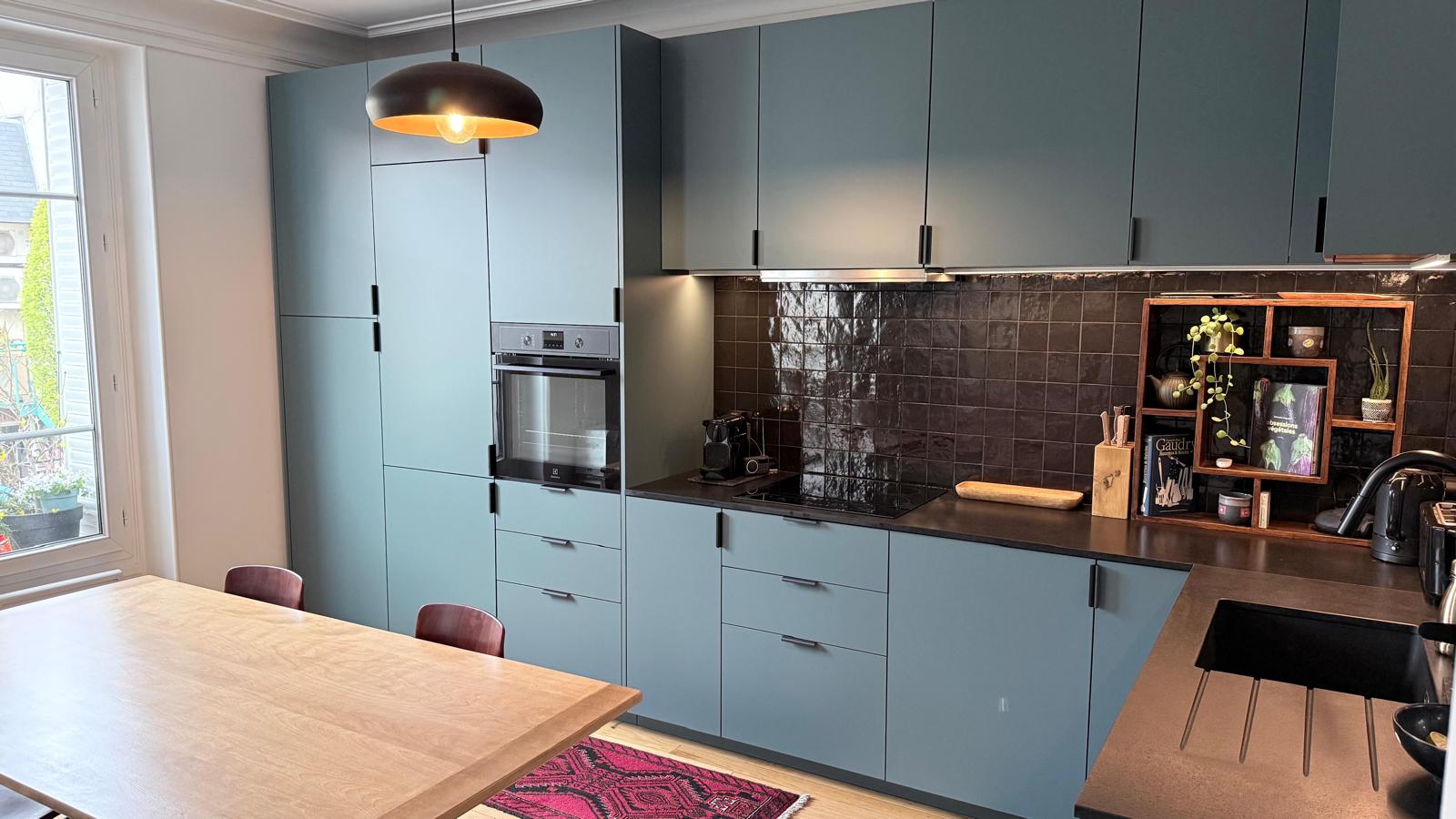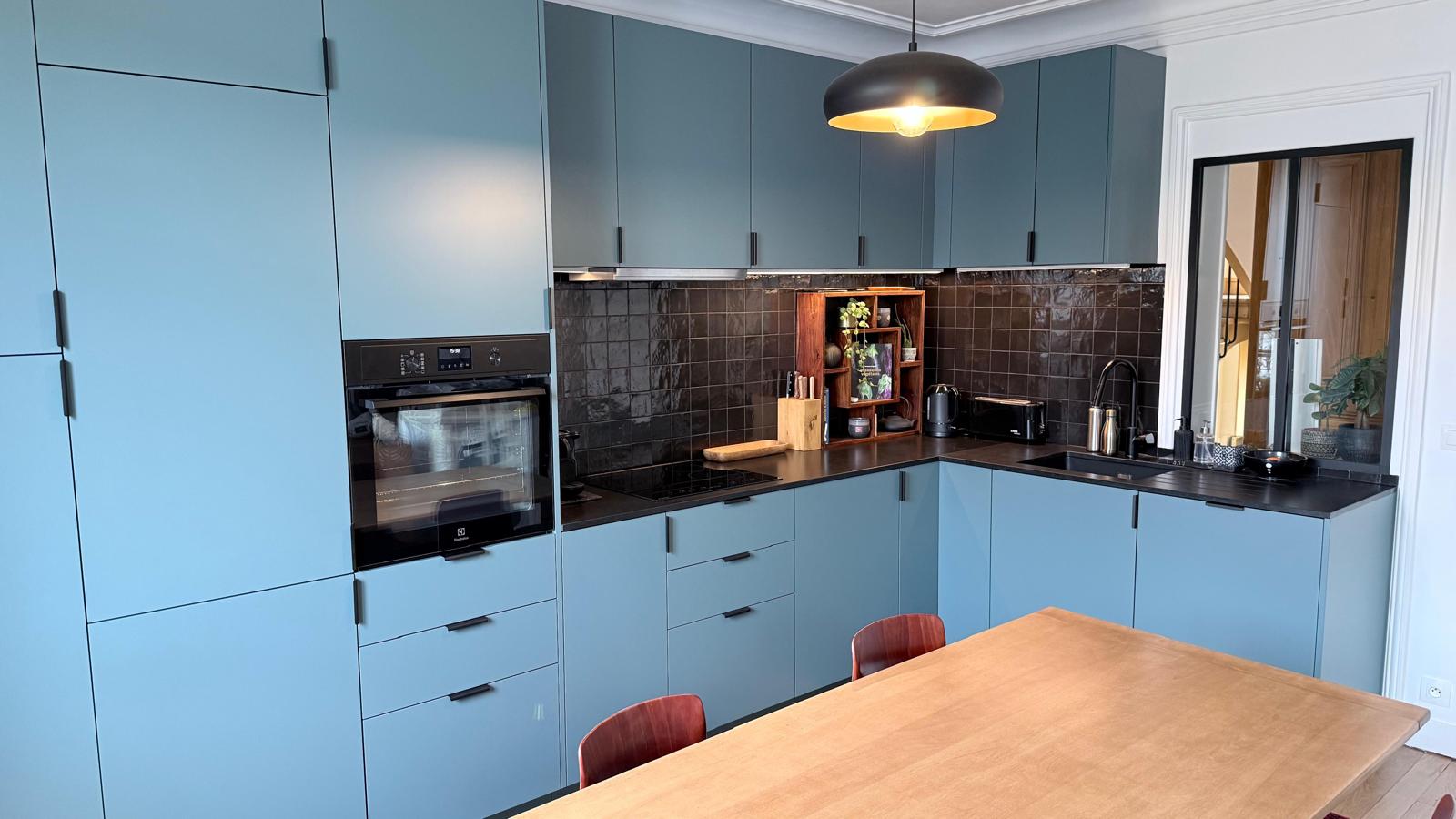 Place ensuite au cœur du projet : la pose de la cuisine en L. Nous avons assemblé et installé l'ensemble des caissons, fixé les façades bleu-vert mat (un ton profond et très tendance qui sublime l'espace), posé le plan de travail noir, raccordé les éléments électroménagers encastrés (four Electrolux, plaque à induction, hotte) et réalisé l'ensemble des raccordements de plomberie pour l'évier.