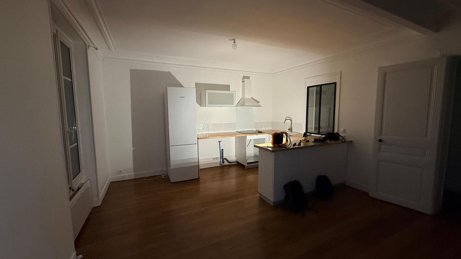 Avant notre intervention, la pièce présentait une cuisine blanche standard, intégrée dans un bel appartement haussmannien avec parquet, moulures et verrière intérieure. Si l'espace avait du potentiel, l'aménagement ne tirait pas parti du volume disponible et l'installation électrique n'était plus adaptée aux besoins actuels des propriétaires.