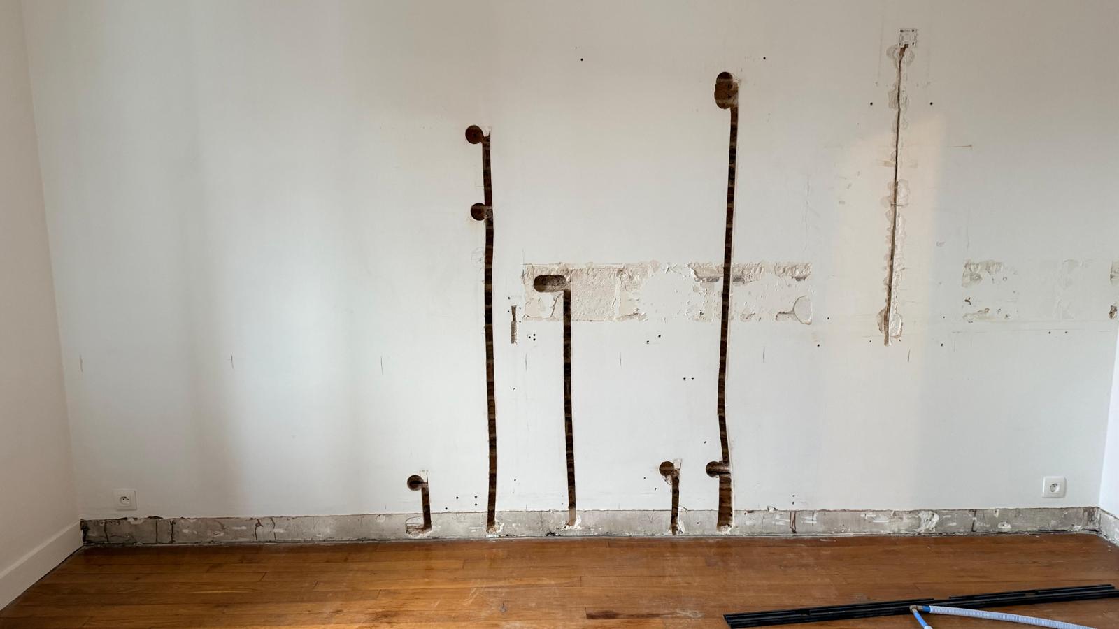 Impossible d'installer une nouvelle cuisine sans repartir sur des bases saines. Nos équipes ont donc commencé par refaire l'intégralité du réseau électrique de la pièce : saignées dans les murs, passage des nouvelles gaines, repositionnement des prises en fonction du futur plan de cuisine (plaque de cuisson, four encastrable, hotte, petit électroménager, éclairage sous meubles haut…).